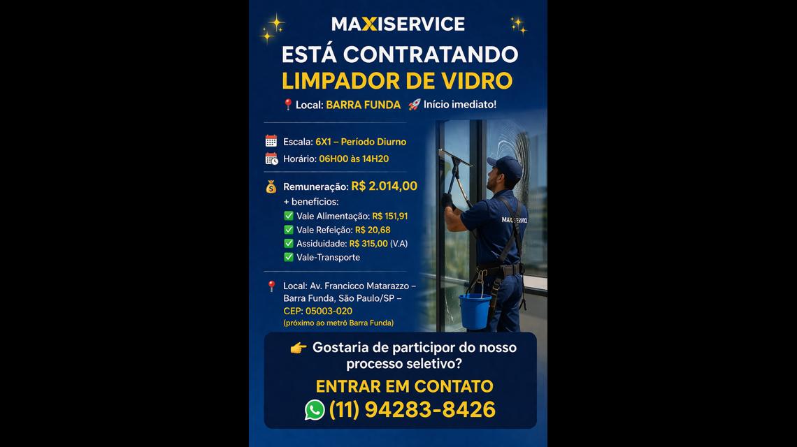 Oportunidade: A MAXI SERVIÇOS LTDA. está em busca de um profissional para a posição de Limpador de Vidro. Trabalhar conosco proporciona um ambiente colaborativo e desafiador, onde você contribuirá para manter a excelência em serviços de limpeza.